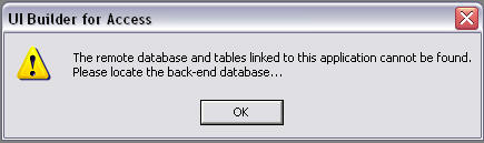 Renamed files, folders, network drive letter, or UNC path changes can all create broken links to your back end databases. The typical resolution is to remove the linked table references in each front end database and re-link each one to the back end database. Repairing linked tables is a pain, that's why UI Builder - Enterprise Edition now features an automatic linked table check when your database loads. If any links are broken, the user is prompted to locate the back end database. UI Builder does the rest...repairing each broken link and allowing users to continue working in seconds.
