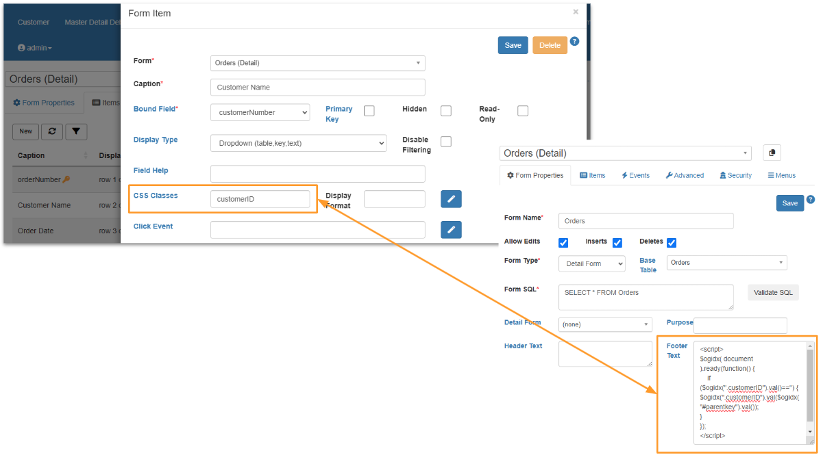 If you would like to automatically populate a dropdown or text field with the primary key value of the parent (e.g., the parent is a Customer, and when a user creates a new child Order record, you want to automatically populate the Order form's CustomerID for the user), follow these steps: